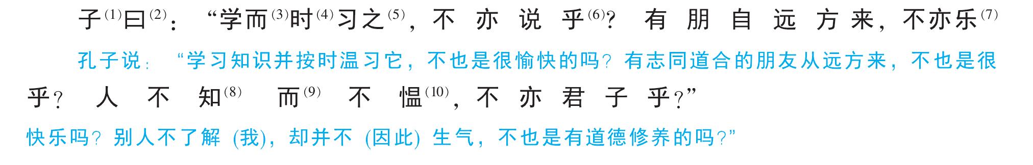 子曰(2):“学而(3)时(4)习之(5),不亦说乎(6)?有朋自远方来,不亦乐(7)乎?人不知(8)而(9)不愠(10),不亦君子乎?”