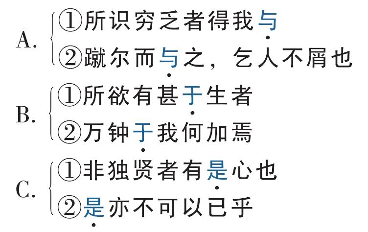 (1) 〔苟得 〕 苟且取得 , 这里是 “苟且偷生 ” 的意思 。 (2) 〔患 〕 祸患 , 灾难 。 (3) 〔辟 〕 通 “避 ”, 躲避, 下同。 (4) 〔如使〕 假如, 假使。 (5) 〔何不用也〕 什么手段不可用呢!(6) 〔勿丧 〕 不丢掉 , 不遗失 。 (7) 〔箪 〕 古代盛饭用的圆竹筐 。 (8) 〔豆 〕 古代盛肉或其他食品的器皿 。(9) 〔呼尔而与之 〕 没有礼貌的吆喝着给他 (吃 )。 (10) 〔蹴 〕 用脚践踏 。 (11) 〔不屑 〕 因轻视而不肯接受 。(12) 〔万钟〕 万钟的俸禄, 形容位高禄厚。 钟, 古代的一种量器。 (13) 〔辩〕 通 “辨”, 辨别。 (14) 〔何加〕 有什么好处。 (15) 〔奉〕 侍奉。 (16) 〔所识穷乏者得我与〕 所认识的贫穷的人感激我吗? 得, 通 “德”, 恩惠, 这里是感激的意思。 与, 通 “欤”, 语气词。 (17) 〔乡为身死而不受〕 从前为了 “礼义” 宁愿死也不接受 (施舍)。乡, 通 “向”, 从前。 (18) 〔是亦不可以已〕 已, 停止、 放弃。 是, 此、 这。 (19) 〔本心〕 天性, 天良。
