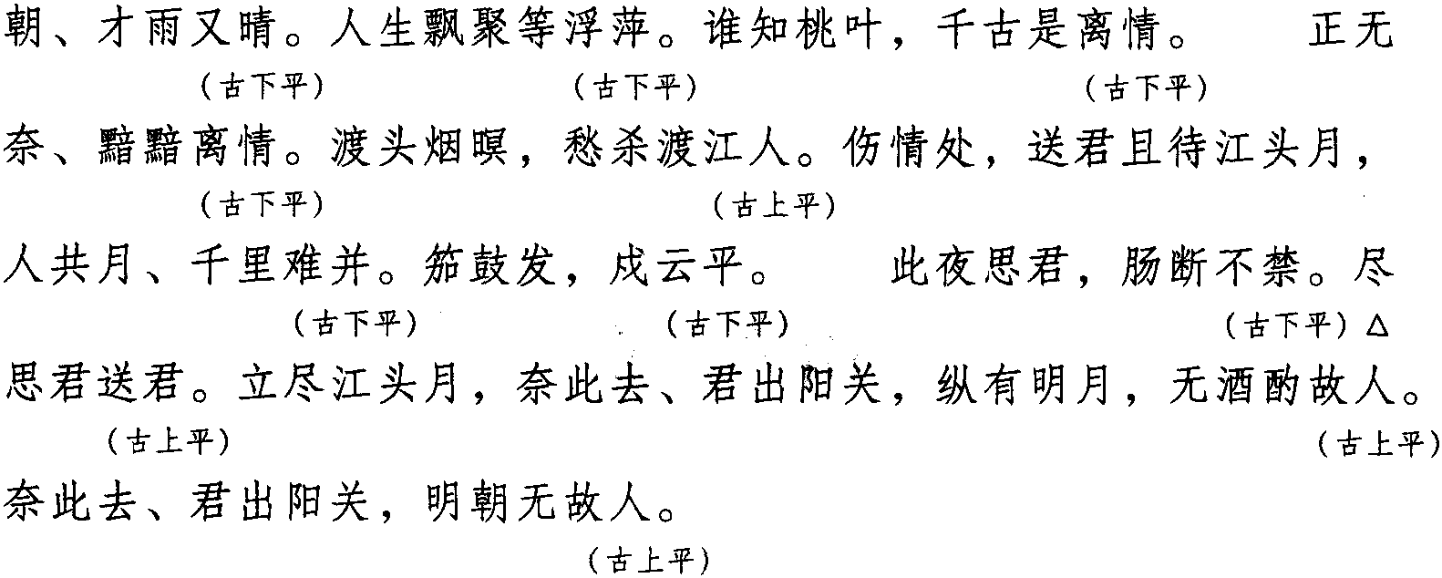注:本词例押古上平声“真” “文”韵,古下平声 “庚” “青” “蒸” “侵”韵。因“真” “文”“庚”“青”“蒸” “侵”与现代韵“声”或“根”属宽韵,故全调可押东部“声” 韵或根部“根” 韵。