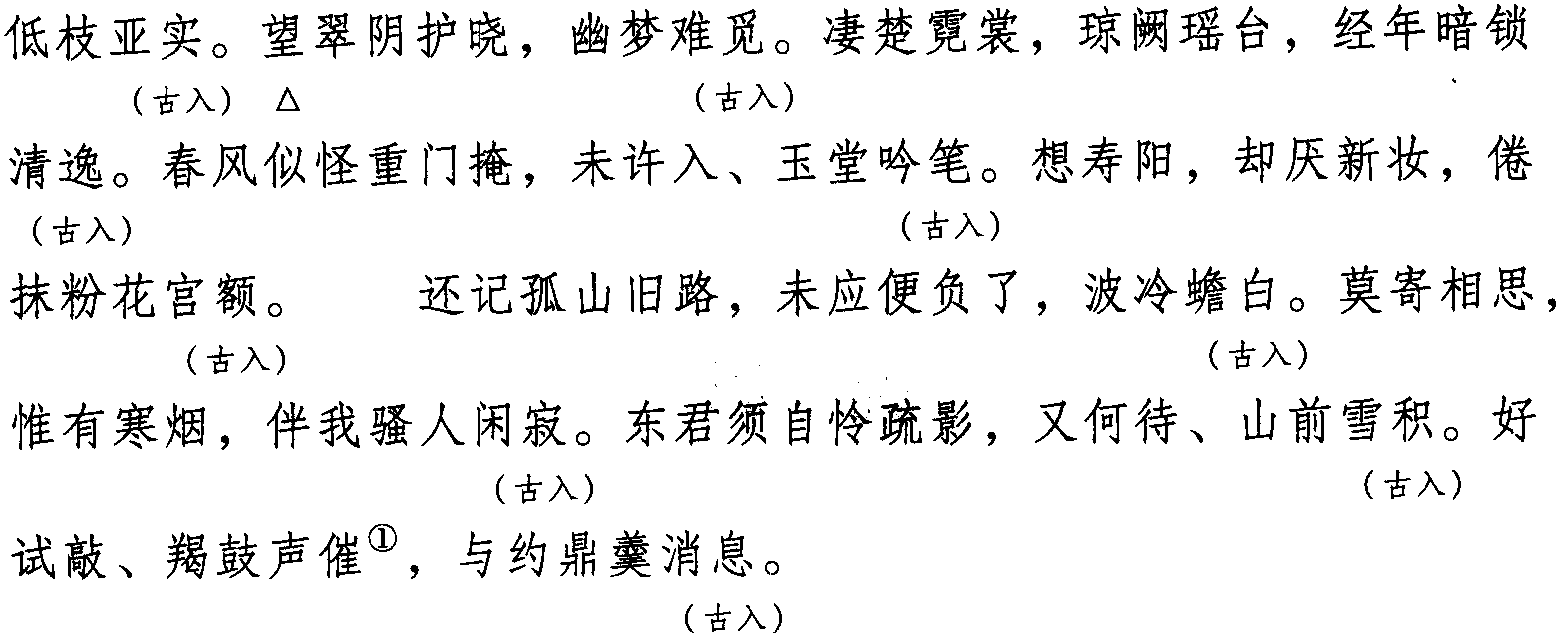 注:一、本词例押古入声“质” “陌” “锡” “职”韵。因“陌” “锡” “职”在古韵中与“碧” “寂” “力”同韵,而“碧” “寂” “力”在现代韵中属“些”韵,“质”与“些”又属宽韵,故全调可押些部“些”韵。