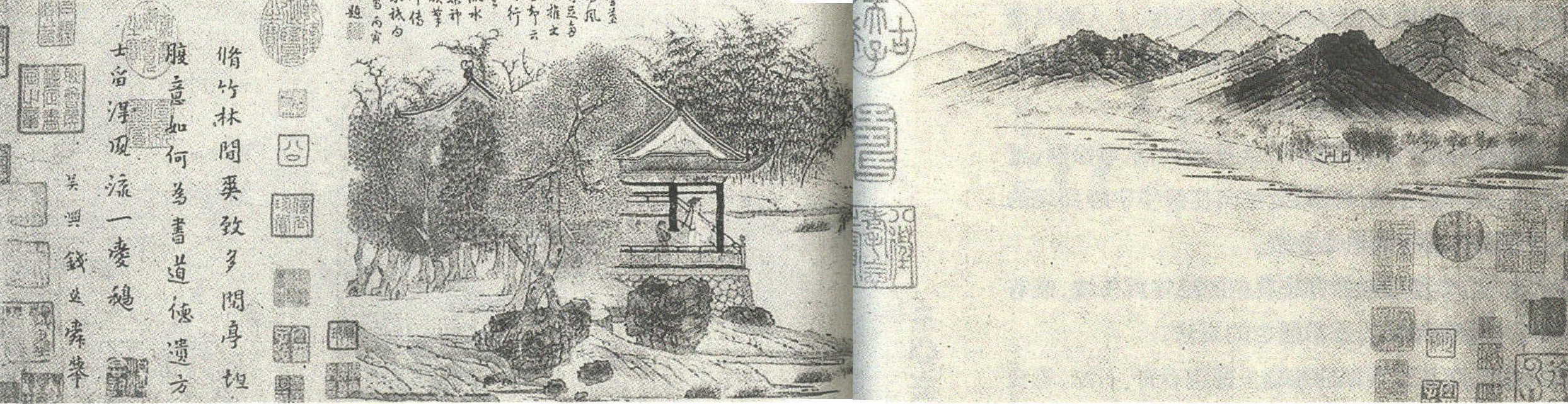 此图与钱选其他几幅山水画一样无年款,美国有一位学者认为约作于1295年,不知何据。画心和拖纸上有“嘉庆御览之宝”、“宣统鉴赏”、“古稀天子”等印四十多方。此图为1973年美国狄龙基金会捐赠。