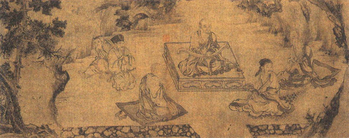 此卷内容画东晋高僧慧远在庐山(在今江西)与文人学士结白莲社之故事。慧远(334—416)俗姓贾,雁门楼烦(今山西宁武附近)人。初学儒,博综六经,尤精于老庄学说的研究。二十一岁出家为道安弟子,讲求“般若性空”之学,讲经时还引《庄子》加以参照解释。他于太元六年(381)入庐山传法,弟子甚众,刺史桓伊还为之在庐山之东建立殿房,称东林寺。寺院背靠香炉峰,瀑布悬挂,尽山水之美。又叠石为假山,环栽松林莲荷,清泉绕阶,白云满室,极清幽之致。相传慧远后来在此建莲社(亦称“白莲社”),有僧俗十八人,倡“弥陀净土法门”,宣称人死后可以往生西方“净土”,被后世净土宗尊为初祖。表现白莲社这一题材,为历史上画家所喜爱,所作甚多,此为其中之一。