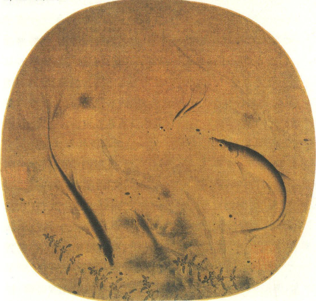 刘寀是文人画鱼的一位集大成者。他少年时流寓京师,狂逸疏放,流连诗酒,与贵戚纨袴相从无虚日,过着放荡不羁的生活。联系这样一种个性气质,他的选择画鱼一科作为抒情的方向,也就在情理之中了。关于他的画鱼,《宣和画谱》卷九称为:“深得戏广浮深、相忘于江湖之意。盖画鱼者鬐鬣鳞刺分明,则非水中鱼矣,安得有涵泳自然之态?若在水中,则无由显露。寀之作鱼,有得于此。他人作鱼,皆出水之鳞,盖不足贵也。由是专门,颇为士人所推誉。”证之这幅《群鱼戏藻图》册,洵为确论。