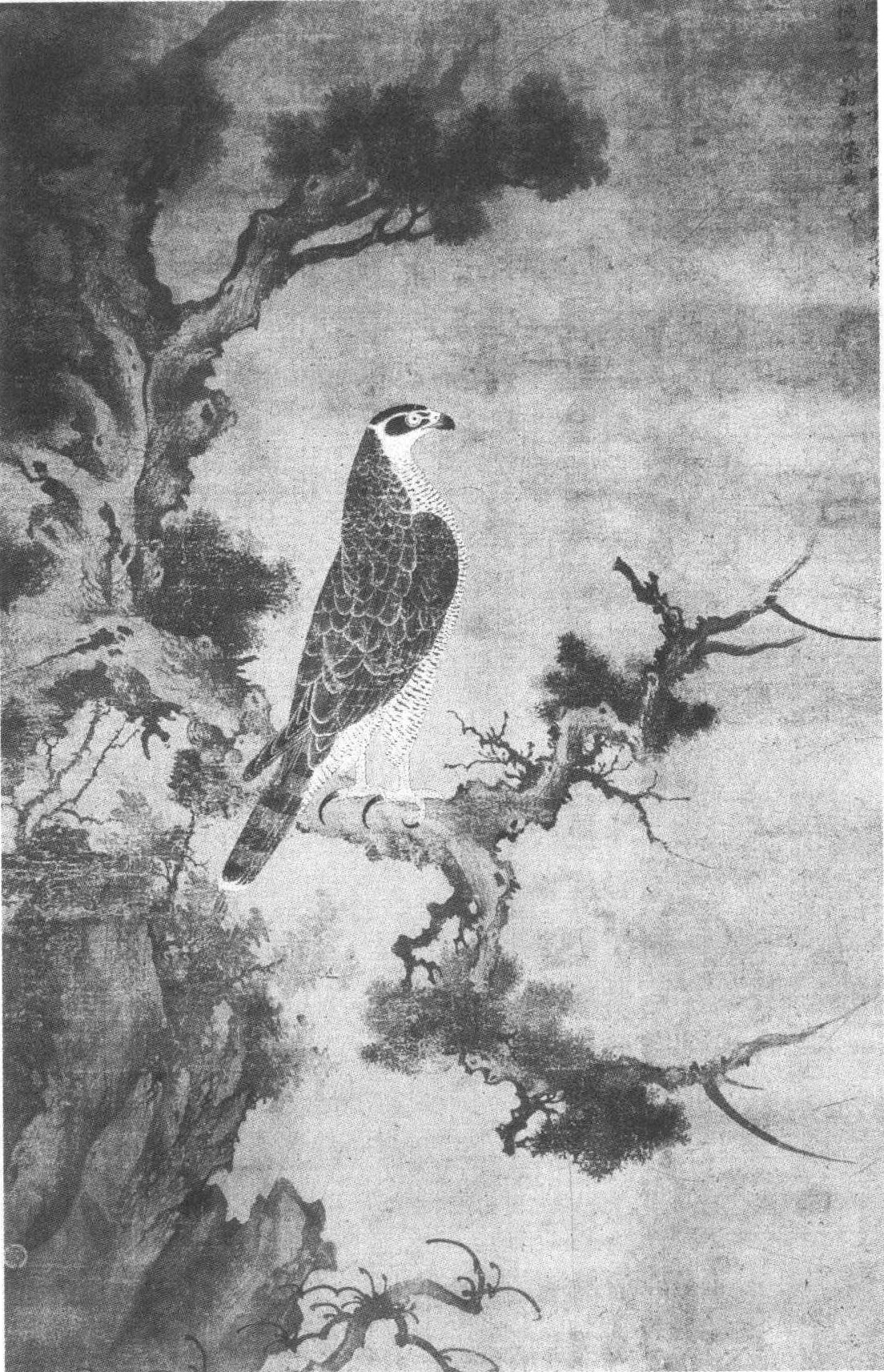 画中自题云:“雪界翁画黄鹰,师夔作古桧,桐城□氏好事,遂与之。”明代吴宽说张舜咨“笔法颇似昆山朱”。朱即朱德润,他山水从郭熙出,画风苍润清逸,和同时的“元四家”等主要师承董、巨而多运用干笔皴擦、重书法意趣的画法有所不同。联系《鹰桧图》的画法,也是以清润为尚,墨法明洁,承李、郭画系,可看出其师承取鉴的渊源。能集前人之长,自出胸臆,这正是此图能传于后世、为人称赏的主要原因。
