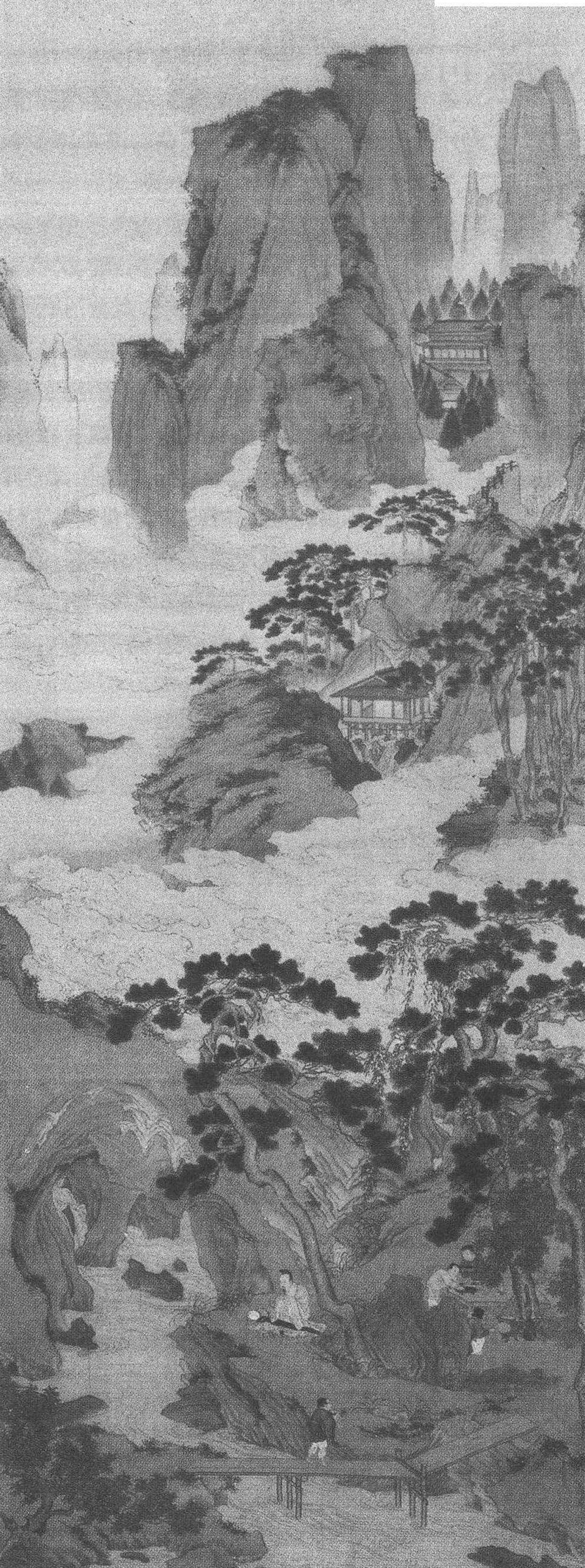 《玉洞仙源图》描绘远离尘埃的人间仙境。画面奇峰峻岭,苍松翠柏,琼楼水阁,溶洞流溪,云烟缥缈其间,山壑时隐时现。溪水潺湲的溶洞前,一士人临流盘膝,停琴静坐,陶冶在自然美景之中,侍童们忙着煮茶、端盘、陈设古玩。瑰丽多姿的山川景色和乐在其中的生活情趣,展现出了士大夫理想的隐逸环境。这类题材和构思,在前人作品中经常出现,但仇英在幽美宁静之中赋予更多欢悦、明快的情调,具有一种健康欢乐的意趣,较少消极遁世之感,在同类隐逸题材中是颇具特色的。