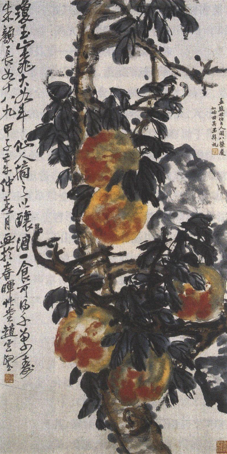 《寿桃图》作于甲子(1924)年,时子云五十一岁,乃值笔墨纯青之期。图中寿桃五枚,硕大如斗,序列在画幅的中下端,上二下三,稳稳悬挂,桃叶映掩疏落于大桃四周,主干顶天立地,一支干从右面横入,以破其板直,一水墨石块方笔写成殿后撑住气势。子云用笔,厚重温润,蕴藉中力度内敛,无霸悍躁动习气。寿桃上的几颗鲜红大点,是全图的点睛处,看来作者是用心处理的,他以错落有致、轻重相济的坠石之笔点簇,把五枚桃子点染得鲜亮夺目,锃光耀人,实中有空灵感,可称一绝。画幅左边长题一绝:“琼玉山桃大如斗,仙人摘之以酿酒。一食可得千万寿,朱颜长如十八九。”诗意可人,大可给画幅生色。