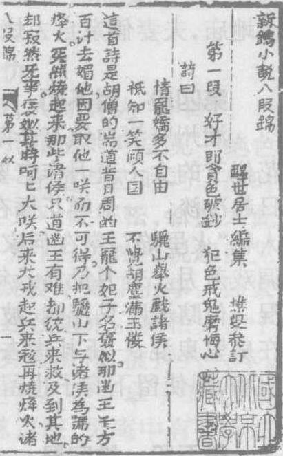 清代白话短篇(拟话本)世情小说选集。八段。题“醒世居士编集,樵叟参订”,其真实姓名不详。成书于清初。