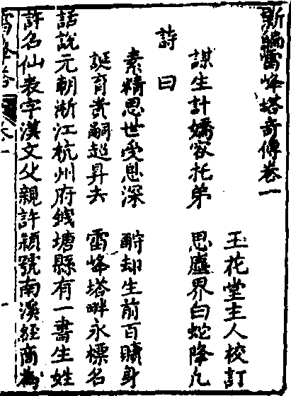 清代白话长篇神魔鬼怪小说。一名《白蛇精记雷峰塔》、《雷峰野史》,又名《雷峰塔全传》、《义妖全传》、《白娘子出世》、《白蛇全传》。五卷十三回。题“玉花堂主人校订”,其真实姓名及生平不详。成书于清嘉庆年间。