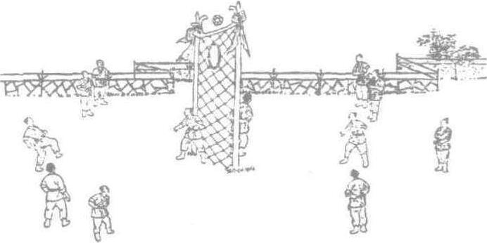 汉代的蹴鞠有两种形式。一种是不受场地限制的娱乐表演性质的花样蹴鞠,表演者可以凭自己的技巧踢出各种花样。这类似一种舞蹈。另一种是在军中进行的,是按照一定规则在一定的场地内举行的对抗性比赛。足球作为军事训练的手段一直持续到东汉三国时期。