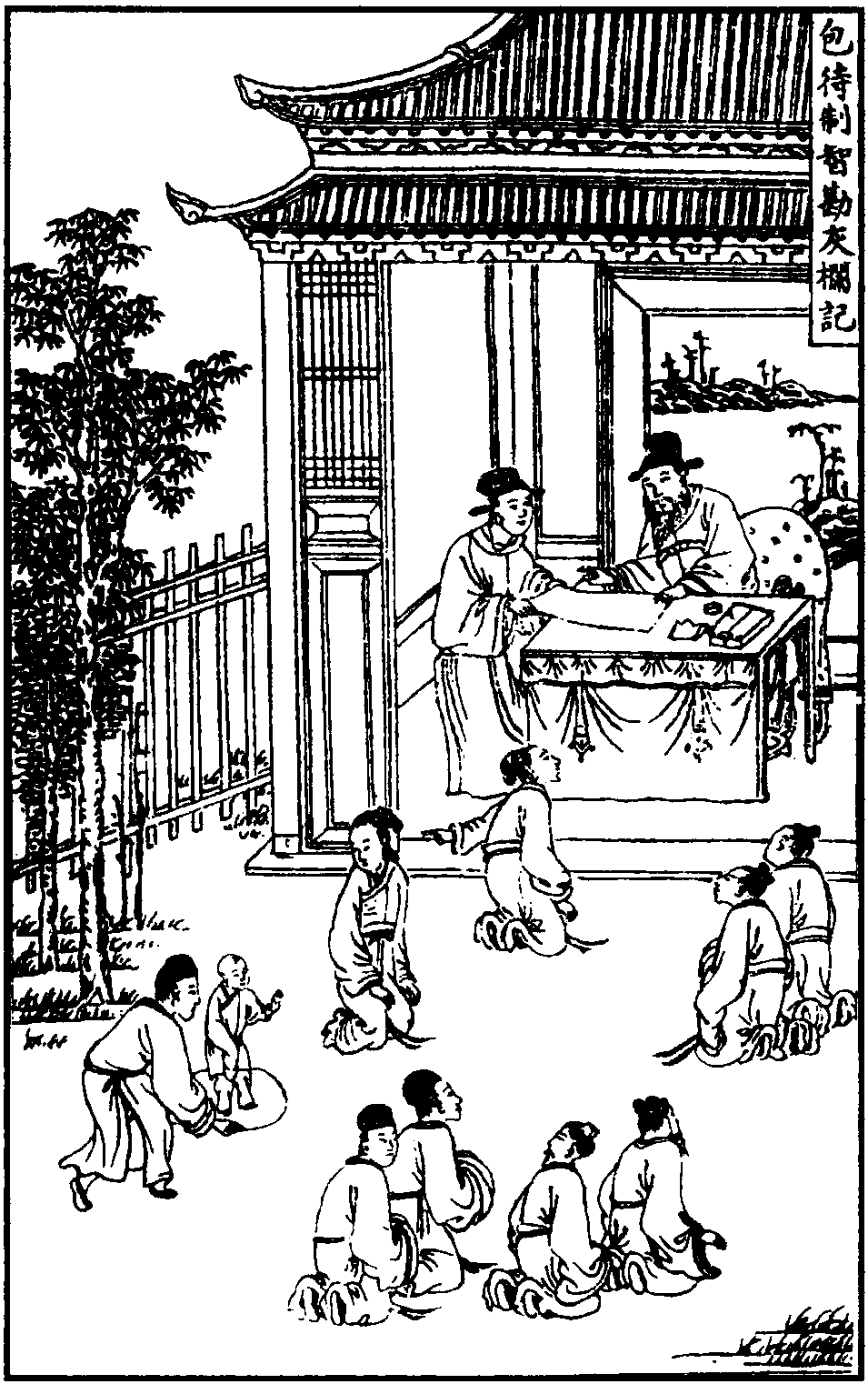 (张千禀云) 郑州续解听审人犯,一起解到。(包待制云) 张千,取石灰来,在阶下画个阑儿。着这孩儿在阑内,着他两个妇人,拽这孩儿出灰阑外来,若是他亲养的孩儿,便拽得出来; 不是他亲养的孩儿,便拽不出来。(张千云) 理会的。(搽旦做拽俫儿出阑科) (正旦拽不出科。) (正旦云) 望爷爷息雷霆之怒,罢虎狼之威。妾身自嫁马员外,生下这孩儿,十月怀胎,三年乳哺,咽苦吐甜,煨干避湿,不知受了多少辛苦,方才抬举的他五岁。不争为这孩儿,两家硬夺,中间必有损伤,孩儿幼小,倘或扭折他肐膊,爷爷就打死妇人,也不敢用力拽他出这灰阑外来,只望爷爷可怜见咱。(唱)