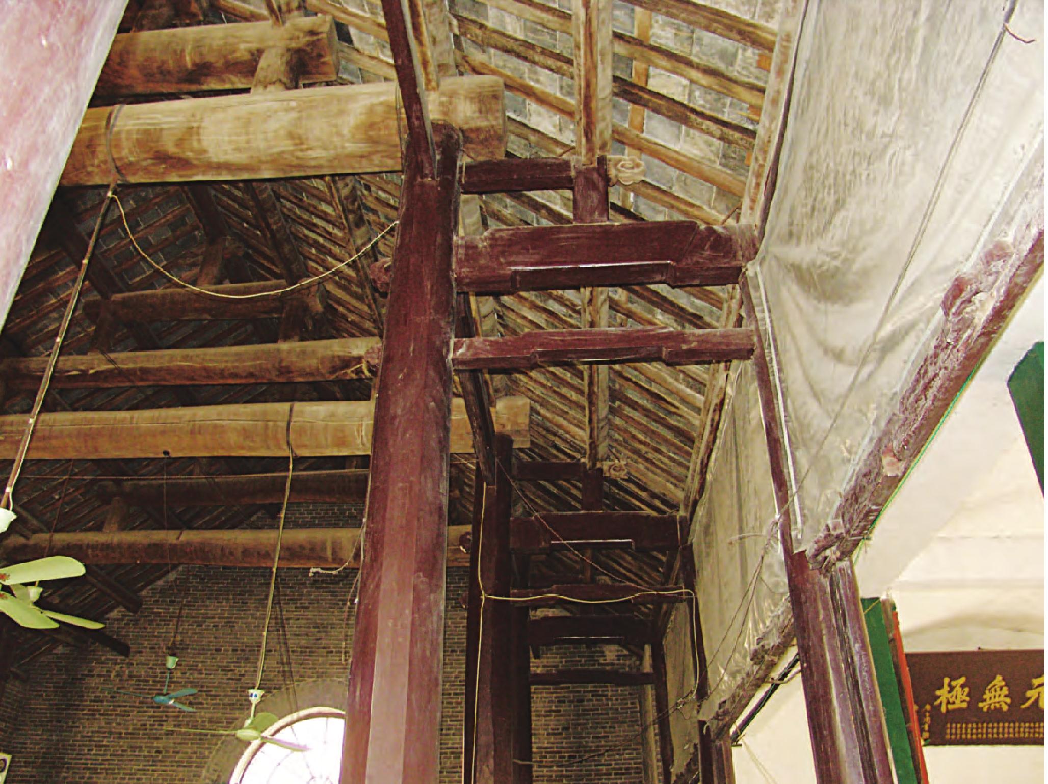寺门面阔三间,进深一间,为前后廊单檐硬山建筑。左右厢房各三间,为单檐硬山灰瓦顶。过殿面阔三间,两山八柱敞庭,单檐硬山灰瓦顶,墀头砖雕植物图案。两侧南北讲经堂各三间,单檐硬山灰瓦顶,并各带一耳房。卷棚与大殿为勾连搭式建筑,由天沟相连。拜殿面阔五间,单檐硬山卷棚灰瓦顶。大殿面阔五间,进深三间,单檐硬山灰瓦顶建筑。原北庭院内经月亮门进入园林,园中有古亭两处,古槐参天,为回民休憩、习武之所。