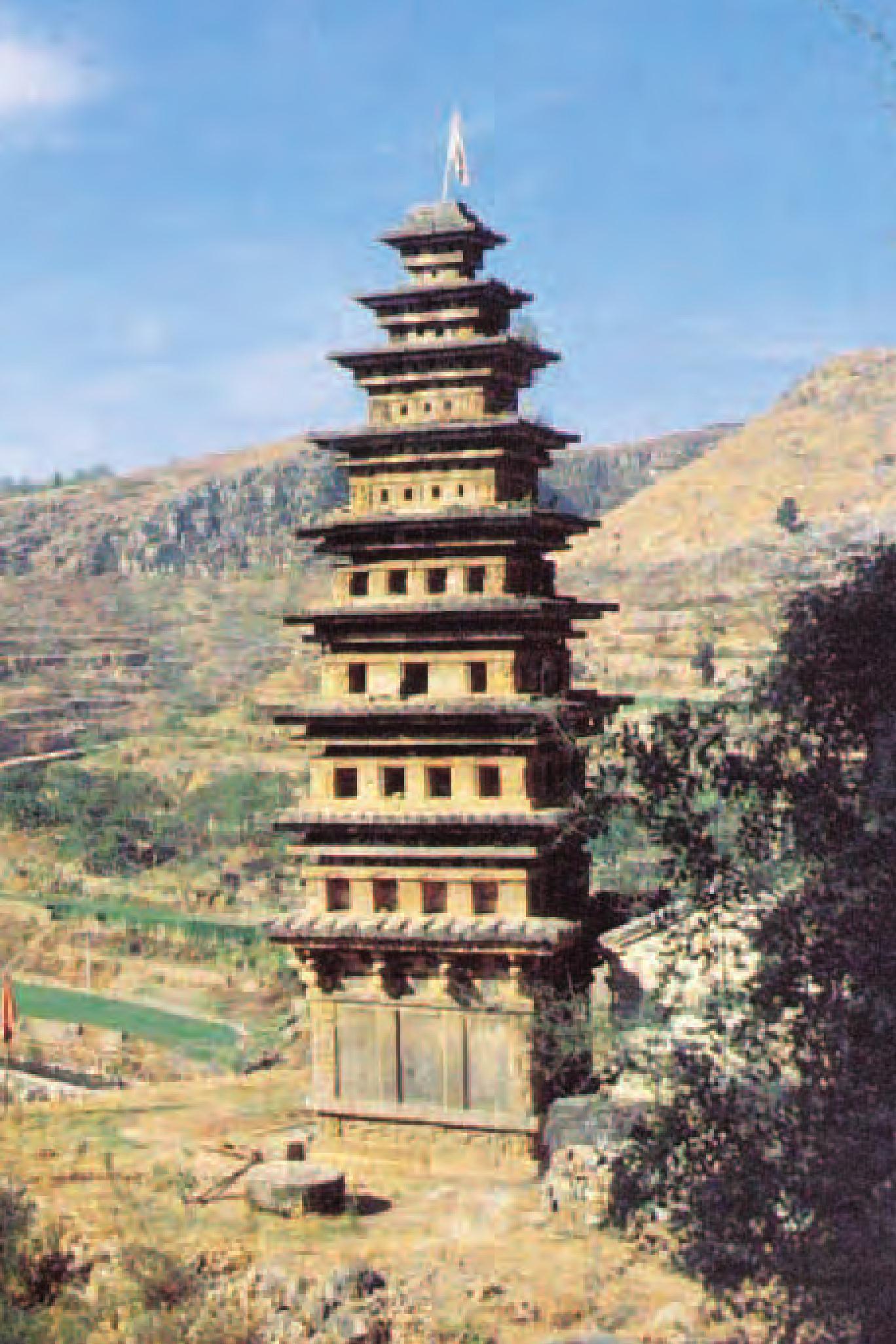 塔身第一层西面辟门,塔体檐下置仿木构斗栱。门两侧各浮雕一躯身穿甲胄的护法武士像。塔心室呈长方形,为海螺顶,高2.80m。第一层四壁转角处各有一根雕刻行龙角柱,龙昂首怒目,须鬣飞拂,四爪舞动,周围衬以卷云纹,雕工精细,堪称杰作。北、东、南三面各内嵌石碑3方。碑额及平板枋阴线刻有图像、佛名、佛像100尊、菩萨20尊以及施舍捐款建塔的题记、施主的姓氏和地址等。第二至九层为实心体,自三层以上每层东西两壁的角柱上均浮雕有托塔力士像,二层至九层每壁均砌有横向排列的壁龛,共计139龛。