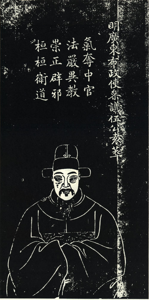 【人物简介:明代官吏。万历八年进士。历仕贵溪知县、兵部主事、员外郎、浙江提学佥事、广东海北道佥事,执法不避贵幸。有《林居漫录》、《弹园杂志》。伍袁萃苏州石刻像刻于1827(清道光七年),清孔继尧绘,石蕴玉正书赞,谭松坡镌,为《沧浪亭五百名贤像》之一。伍袁萃半身像取自清顾沅辑,道光九年刻本《吴郡名贤图传赞》,清孔继尧绘。】