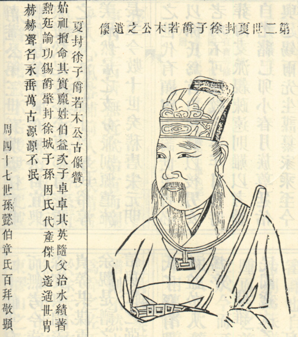 【人物简介:夏代王侯。伯益次子。随父治水有功,受封泗州徐城,为子爵。像取自1915年修《江苏毘陵徐氏宗谱》。】