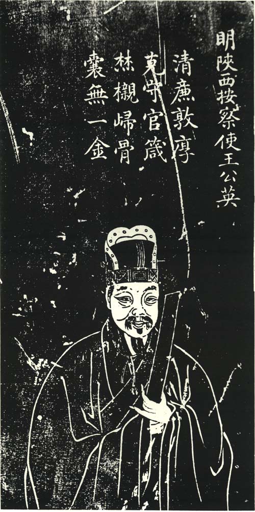 【人物简介:明代官吏。洪武初,以乡校贡太学选授山东监察御史,迁都御史,官至陕西按察使。王英石刻像刻于1827(清道光七年),清孔继尧绘,石蕴玉正书赞,谭松坡镌,为《沧浪亭五百名贤像》之一。像取自清代顾沅辑,道光九年刻本《吴郡名贤图传赞》,清孔继尧绘。】