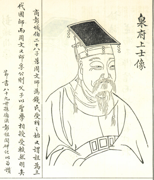 【人物简介:周代官吏,相传系籛铿铿第二十八子,为周文王师,官拜钱府上士,因去籛之株而为钱,乃钱氏受姓之始祖。像取自清嘉庆修《吴越钱氏宗谱》。】