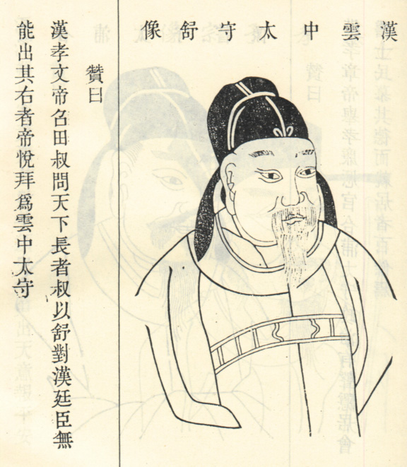 【人物简介:西汉官吏。高祖拜为云中守。因匈奴犯边,士卒战死数百,坐罪免官。文帝立,官复原职。像取自1928年修《江苏毘陵孟氏宗谱》。】
