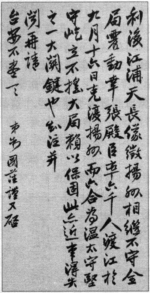 同治九年八月初八日写给曾纪泽的信。信中说: “字谕纪泽儿: 接尔初四、五、六、七等日禀,具悉一切。余之谢恩摺于初七日拜发,恭辞两江新任,实不敢以病躯当此重寄。摺稿钞寄尔阅,昨已寄澄、沅两叔矣。如左目长有一隙之明,则还山亦有至乐; 若全行盲废,则早晚总不能服官,趁此尽可引退,何必再到江南画蛇添足? ”查曾国藩于同治九年八月初七日具摺辞两江总督新任,当时曾国藩“胃口尚好,惟两腿酸软未愈,上下皆需人扶掖”,他在信中称他“早晚总不能服官,趁此尽可引退,何必再到江南画蛇添足” ?可看出曾国藩“不敢以病躯当重”的为官之道。