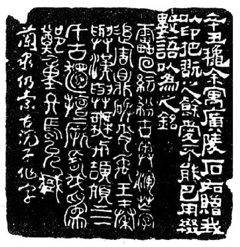 此印道出了邓石如人生另一段经历。邓石如终生布衣,仅是寿州寿春书院的一名诸生,后又客居梅镠府,因而有机会纵观历代金石篆刻。梅镠有一幅赠邓石如的隶书联,上款说:“古浣子吾友,于乾隆庚子夏至白门,留六阅目,刀篆既造古人之堂,其摹秦相唐监书复一日千里之效,欣赏之余,书以为赠。”“一日千里之效”即指邓天不亮便起床,研墨盈盘,至夜晚墨尽后就寝的岁月。自此8年寒暑不辍,遂工4种书体。篆法以李斯、李阳冰为宗,而又能纵横捭阖之妙,再得之古籀,稍参隶意,杀锋以取劲折,所以字体微方,与秦汉瓦当额文尤为相近,分书则遒丽淳质,结体极严整而浑融。篆刻初学汉印,后以小篆入印,刀法圆转苍劲。他性格兼洁,就是名成之后,还是以书、刻自给,唯以书印为嗜,而以布衣而终。“意与古会”实是邓石如在梅镠家前后8年,置身于那浩如烟海的秦汉艺术宝库中,如饥似渴、刻苦学习,推崇其意的最大收获。