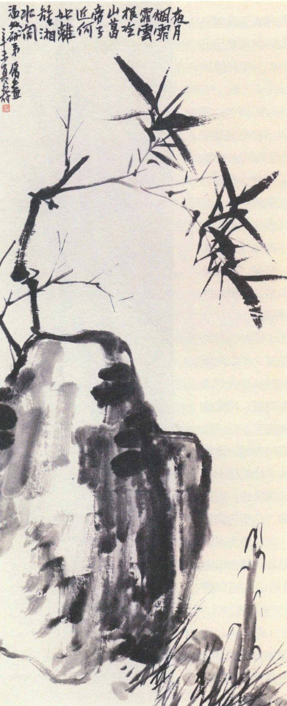 二是《竹石图》 (图88)。梅兰竹菊四君子是传统文人画家喜爱的题材,潘天寿亦经常入画。此画作于1931年,画中生长在顽石上的一株弯曲老竹,奇崛劲健,并生发出新篁,新篁之叶刚健峻峭,与画面下一株新笋相呼应; 顽石圆中寓方,笔酣墨畅,画法依然带有吴昌硕的影子。此画格调高雅,构图和笔墨已出现潘氏风格。此画为20世纪30年代潘天寿画风逐渐形成期的作品。