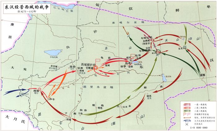 公元73年至152年,东汉王朝为与北匈奴争夺对西域诸国控制权,恢复对西域统治史称“三通三绝”的作战。