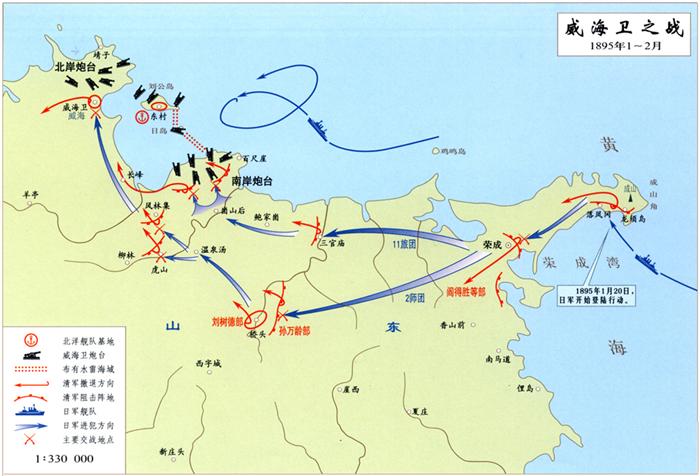 1894年11月下旬,日军攻占辽东半岛大部地区后,即调整作战计划,转兵渡海南下,于次年1月20日开始在山东半岛东部的荣成湾实施大规模登陆,发起旨在全歼北洋舰队的山东半岛战役。威海卫位于山东半岛东北部,与辽东半岛南端的旅顺口相遥望。旅顺口失守后,威海卫成为北洋舰队唯一的驻泊港和大本营。港区南北两岸及刘公岛等处共建有23座炮台,有清军16营驻守,港内驻泊北洋舰队大小舰船20余艘。