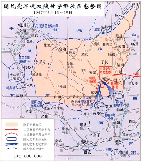 国民党军进攻陕甘宁解放区态势图 1947年3月13~19日