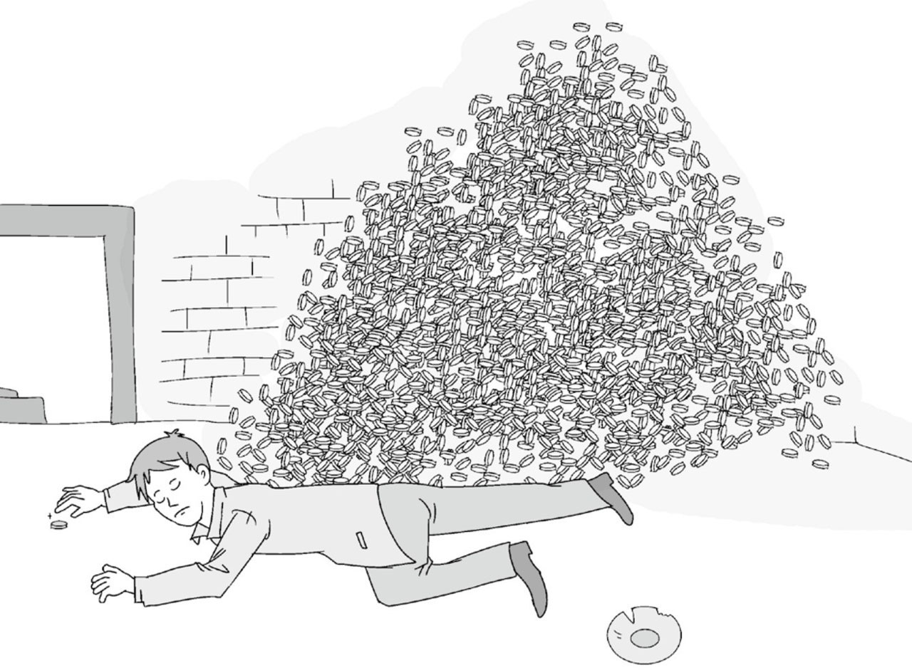 想到了这些,年轻人感觉自己现在的钱还不够多,于是不吃不喝地又跑去账房取钱,当银币堆满屋子的时候,他自己却由于饥饿过度死在了金山旁,满屋子的银币一个也没有花出去。