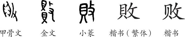 “败”是会意字。甲骨文左边是“貝”,右边是手持棍,会以棍敲击使贝毁坏之意。金文叠为二“貝”,小篆承接金文而来。隶变后楷书写作“敗”。汉字简化后写作“败”。