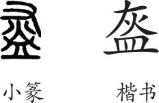 “盔”是后起字,为形声字。楷书写作“盔”,从皿(表示与容器有关),灰声。