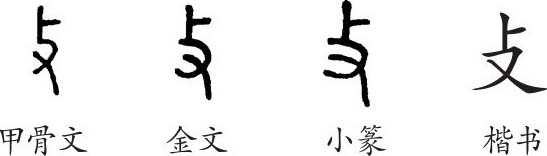 “攴”是会意字。甲骨文、金文、小篆都像手持棍子或鞭子的样子,会手拿棍子或鞭子敲击、扑打东西之意。