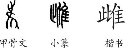 “雌”是形声字。甲骨文从隹,止声。小篆变为从隹。此声隶变后楷书写作“雌”。