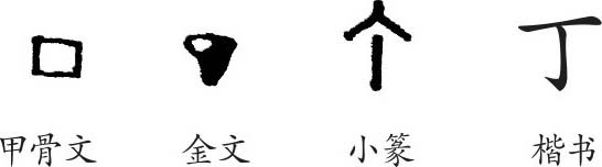“丁”是象形字。甲骨文形体像俯视所见的钉头之形。金文像钉子的侧视图。小篆线条化。隶变后楷书写作“丁”。