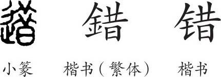“错”是形声字。小篆从金,昔声。隶变后楷书写作“錯”。汉字简化后写作“错”。