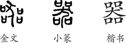 “器”是会意字。金文的中间是一条犬,犬的周围是四个“口”,表示器物,会器物很多之意,用犬来看守。小篆的形体与金文相似,并整齐化。隶变后楷书写作“器”。
