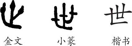 “世”是会意字。金文的形体是三个带圆点的竖,就是古代的三十(卅)。在小篆中,三个小圆点变成了一小横。隶变后楷书写作“世”。