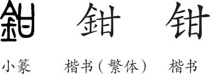 “钳”是形声字。小篆从金,甘声。隶变后楷书写作“鉗”。汉字简化后写作“钳”。