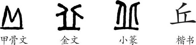 “丘”是象形字。甲骨文像有两个山峰的山丘。金文像两山之间有一条大沟的形状。小篆承接金文,并整齐化、线条化。隶变后楷书写作“丘”。