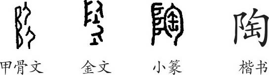 “陶”是会意兼形声字。甲骨文从阜,从上下二人,会人登上窑包之意。金文加二“土”,强调是土堆成的窑包。小篆从阜从匋会意,匋兼表声。隶变后楷书写作“陶”。