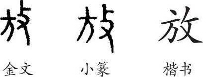 “放”是会意兼形声字。金文和小篆从攴(手执刑杖),从方(远方),会驱逐、流放到远方之意,方也表声,隶变后楷书写作“放”。