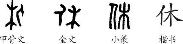 “休”是会意字。甲骨文、金文、小篆都像一个人依傍树木休息之形。隶变后楷书写作“休”。